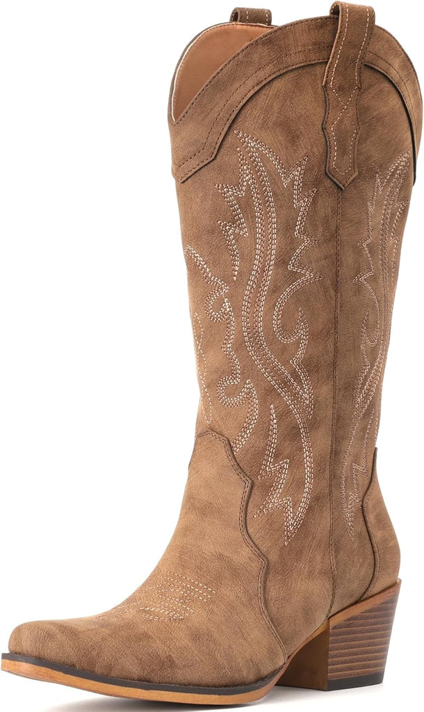 VUN Cowboy Boots For Women Western Cowgirl Boots with Chunky Heel Mid Calf Snip Toe Ideal for low insteps