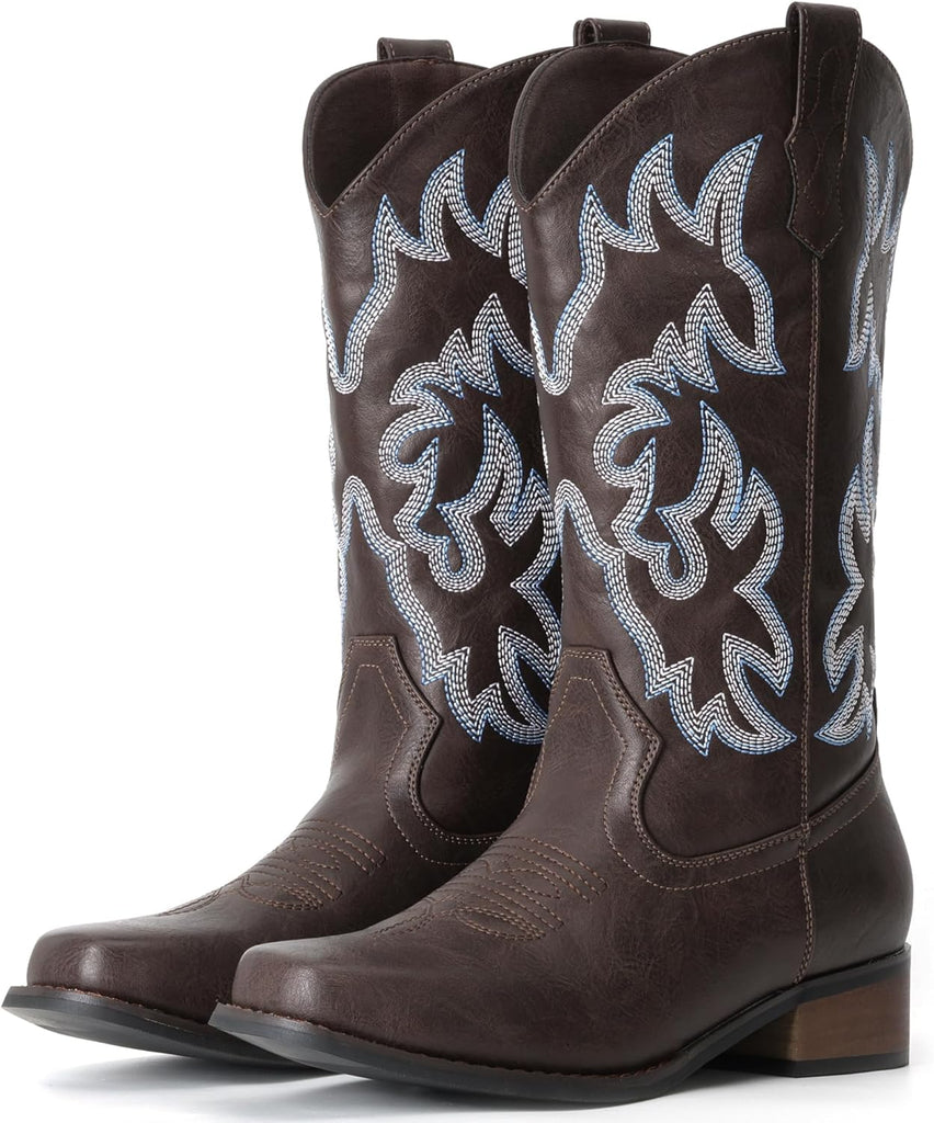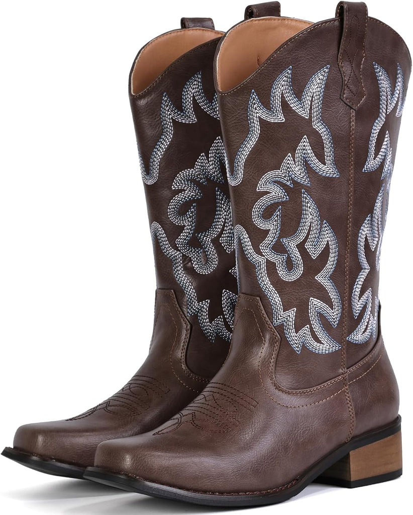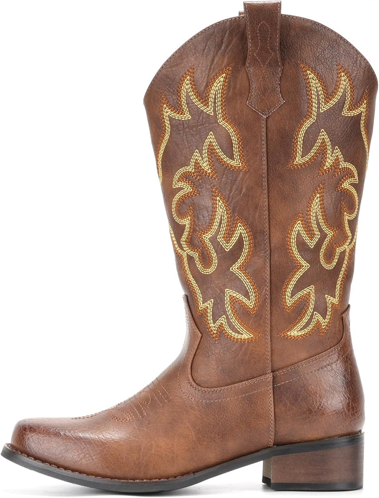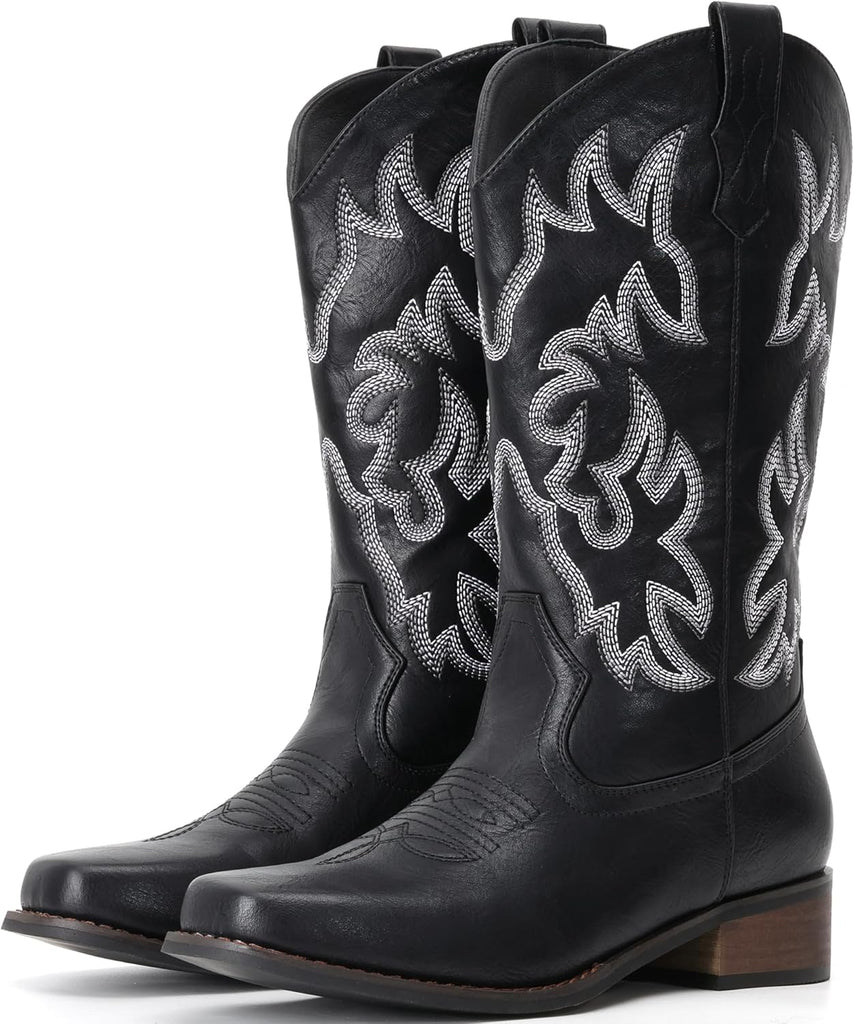 VUN Cowboy Boots For Women Square Toe Cowgirl Boots Mid Calf Western Boots Pull On