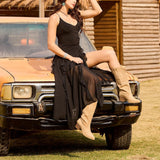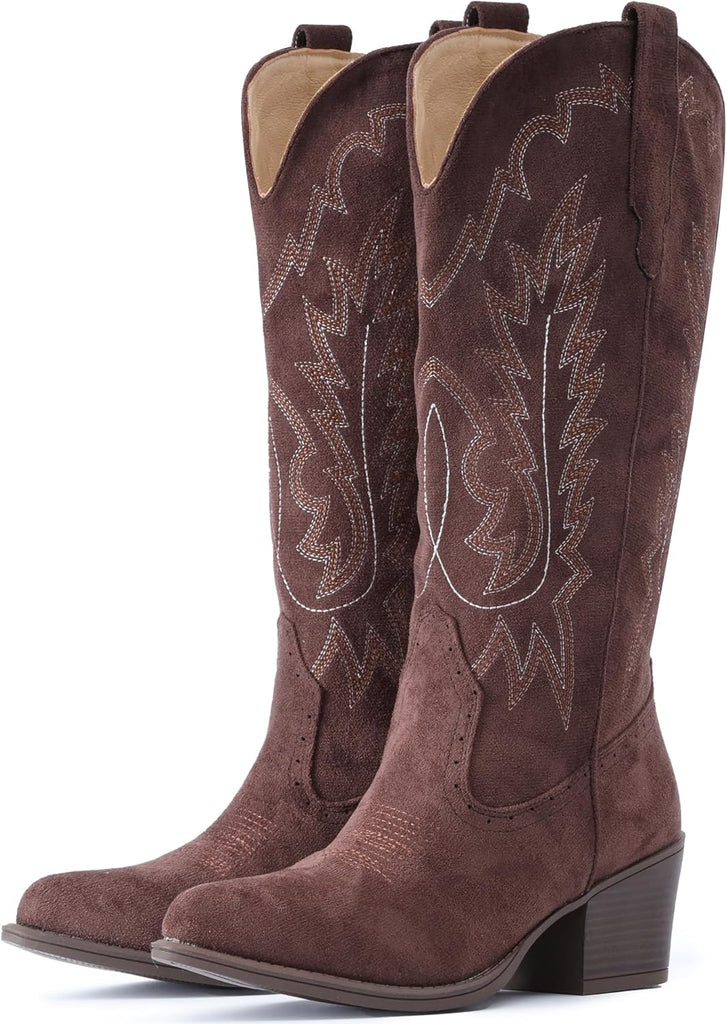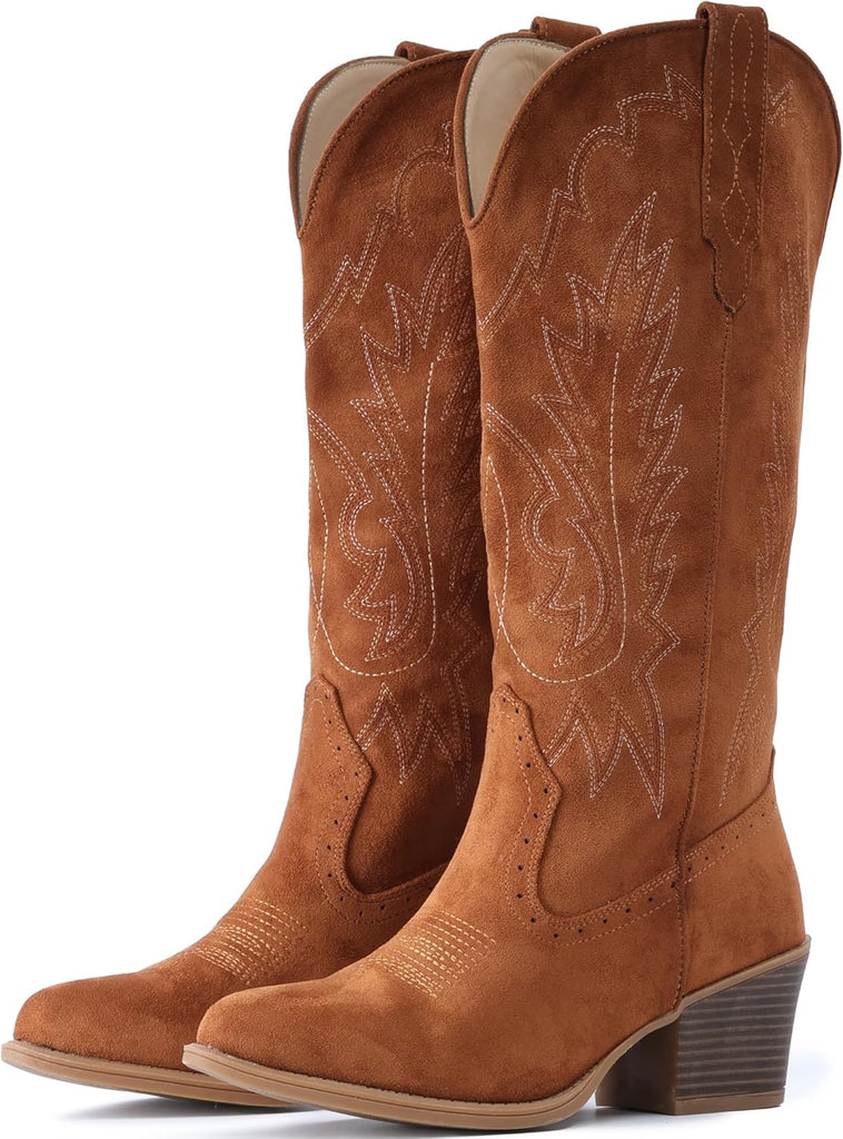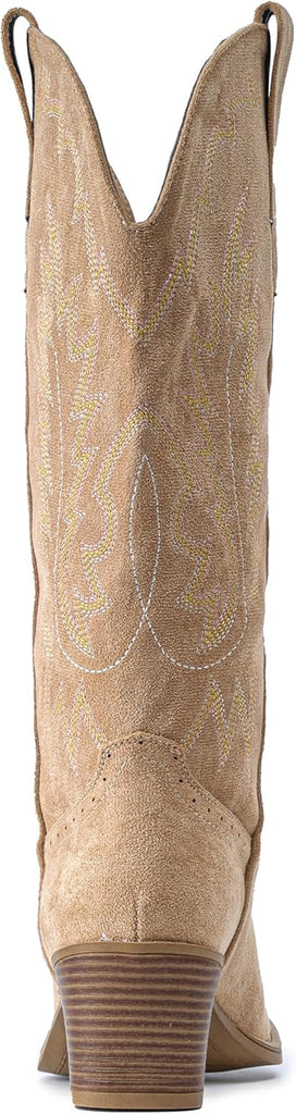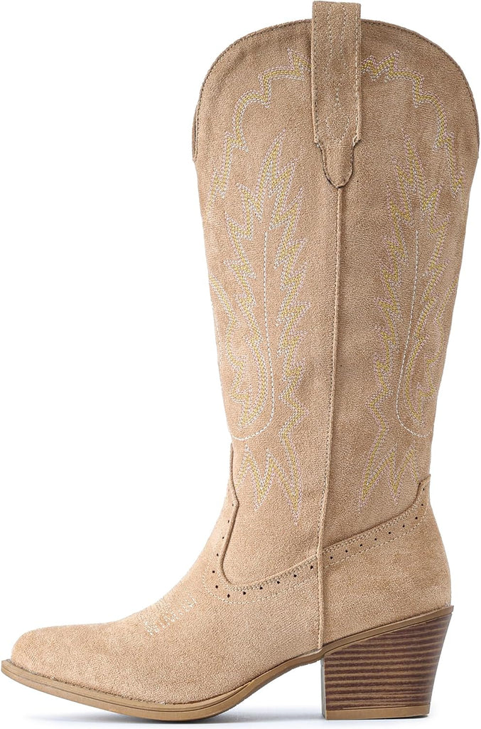 VUN Suede Cowboy Boots For Women Chunky Heel Pointed Toe Cowgirl Boots Mid Calf Western Embroidery fall Boot