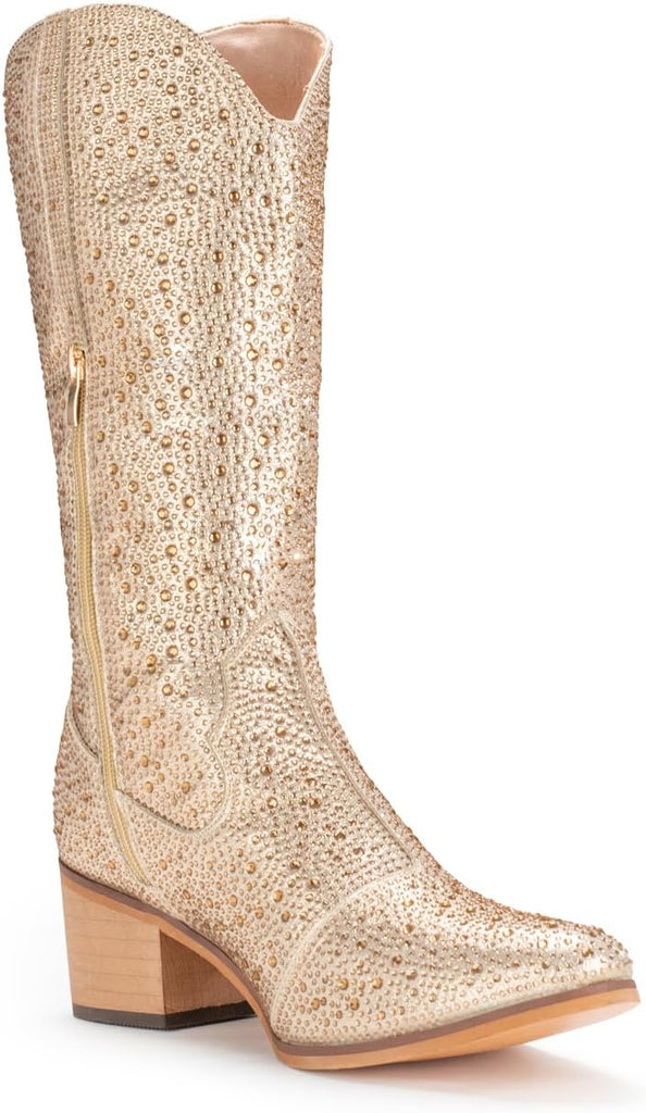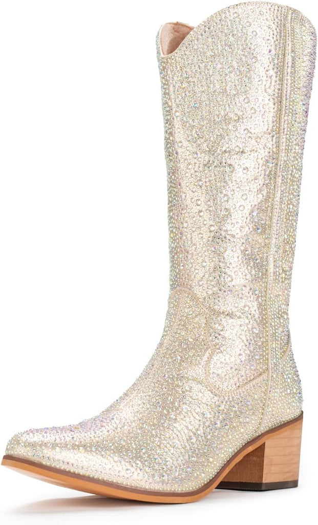 - Unique Design -The specially designed diamond inlay process retain sparkling diamonds on western boots for a long time. Pointed toe, chunky heel and knee high shaft is perfect to lengthen your overall body proportion.