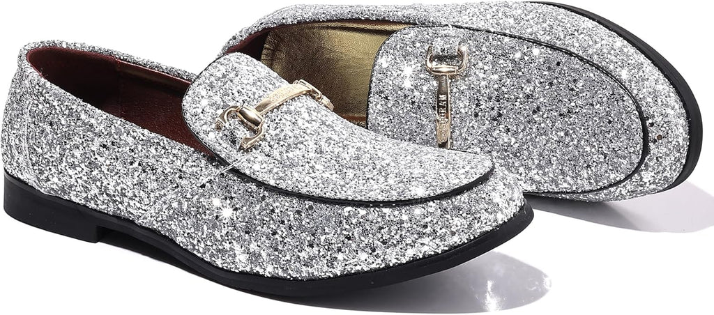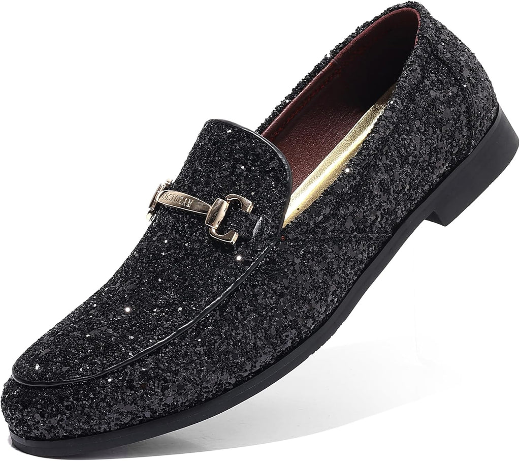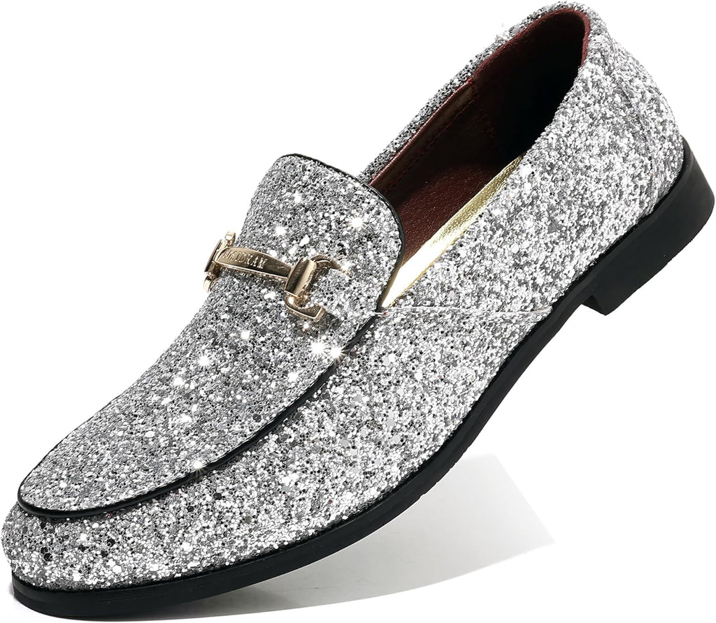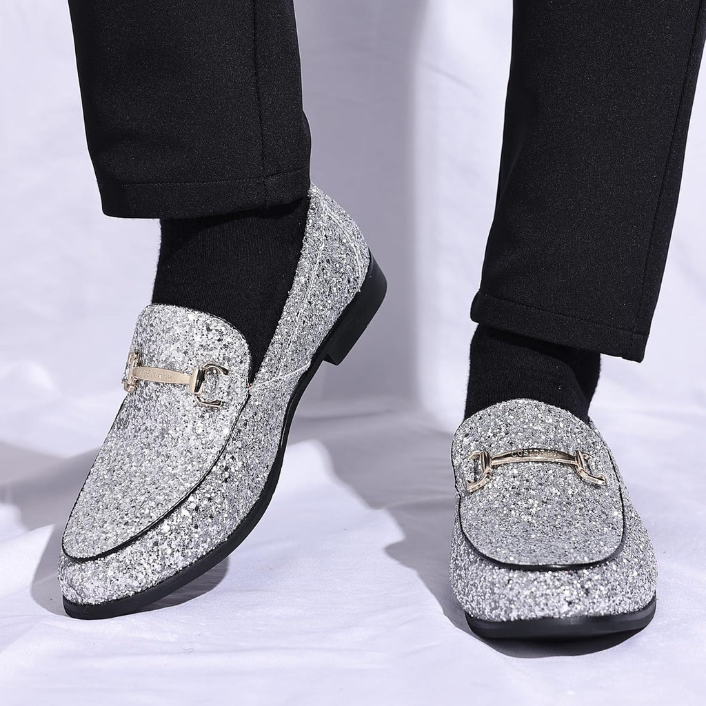 VIM Men's Glitter Dress Shoes Metallic Sequins Tuxedo Luxury Gold Buckle Loafers